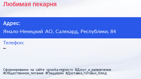 Любимая, пекарня по адресу Ямало-Ненецкий АО, Салехард, Республики, 84 в дальнейшем Организация, размещена в следующих категориях: