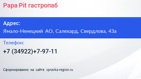 Papa Pit, гастропаб по адресу Ямало-Ненецкий АО, Салехард, Свердлова, 43а в дальнейшем Организация, размещена в следующих категориях: