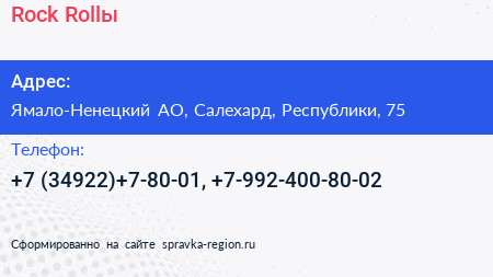 Rock & Rollы по адресу Ямало-Ненецкий АО, Салехард, Республики, 75 в дальнейшем Организация, размещена в следующих категориях: