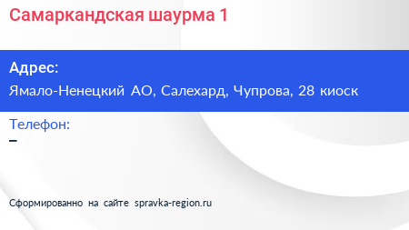 Самаркандская шаурма №1 по адресу Ямало-Ненецкий АО, Салехард, Чупрова, 28 киоск в дальнейшем Организация, размещена в следующих категориях:
