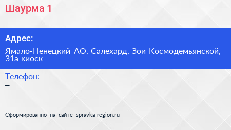 Шаурма №1 по адресу Ямало-Ненецкий АО, Салехард, Зои Космодемьянской, 31а киоск в дальнейшем Организация, размещена в следующих категориях: