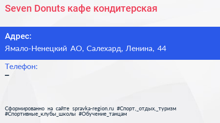 Seven Donuts, кафе-кондитерская по адресу Ямало-Ненецкий АО, Салехард, Ленина, 44 в дальнейшем Организация, размещена в следующих категориях: