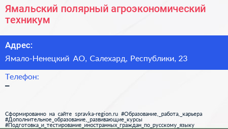 Ямальский полярный агроэкономический техникум по адресу Ямало-Ненецкий АО, Салехард, Республики, 23 в дальнейшем Организация, размещена в следующих категориях: