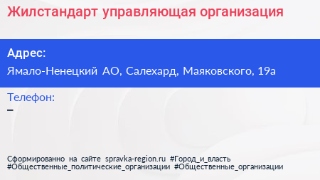 Жилстандарт, управляющая организация по адресу Ямало-Ненецкий АО, Салехард, Маяковского, 19а в дальнейшем Организация, размещена в следующих категориях: