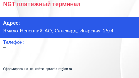 NGT, платежный терминал по адресу Ямало-Ненецкий АО, Салехард, Игарская, 25/4 в дальнейшем Организация, размещена в следующих категориях: