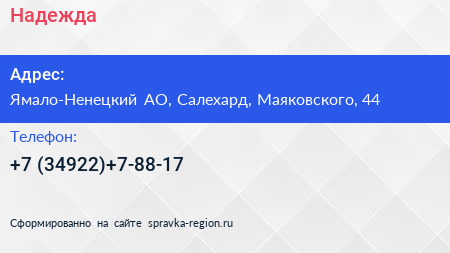 Надежда по адресу Ямало-Ненецкий АО, Салехард, Маяковского, 44 в дальнейшем Организация, размещена в следующих категориях:
