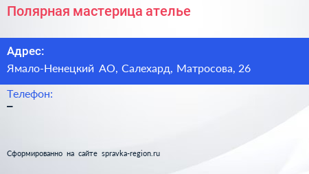 Полярная мастерица, ателье по адресу Ямало-Ненецкий АО, Салехард, Матросова, 26 в дальнейшем Организация, размещена в следующих категориях: