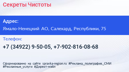 Секреты Чистоты по адресу Ямало-Ненецкий АО, Салехард, Республики, 75 в дальнейшем Организация, размещена в следующих категориях: