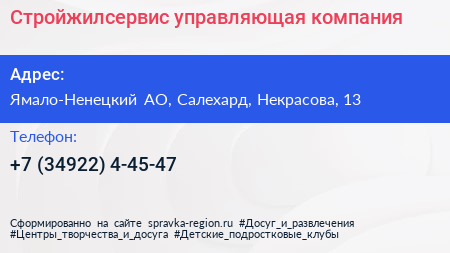 Стройжилсервис, управляющая компания по адресу Ямало-Ненецкий АО, Салехард, Некрасова, 13 в дальнейшем Организация, размещена в следующих категориях: