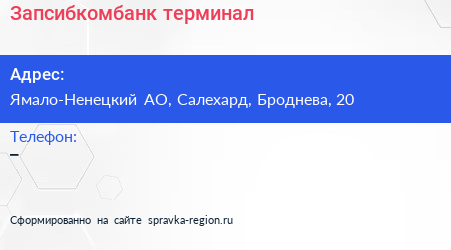 Запсибкомбанк, терминал по адресу Ямало-Ненецкий АО, Салехард, Броднева, 20 в дальнейшем Организация, размещена в следующих категориях:
