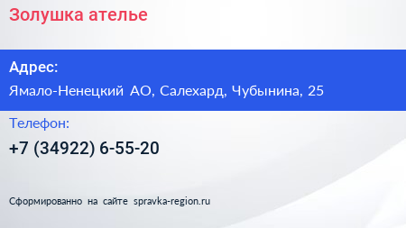 Золушка, ателье по адресу Ямало-Ненецкий АО, Салехард, Чубынина, 25 в дальнейшем Организация, размещена в следующих категориях: