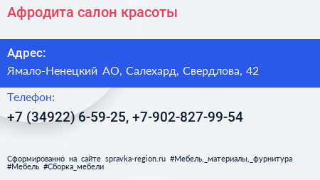 Афродита, салон красоты по адресу Ямало-Ненецкий АО, Салехард, Свердлова, 42 в дальнейшем Организация, размещена в следующих категориях: