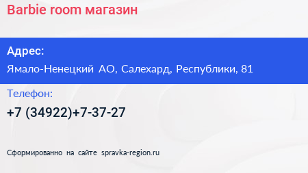 Barbie room, магазин по адресу Ямало-Ненецкий АО, Салехард, Республики, 81 в дальнейшем Организация, размещена в следующих категориях: