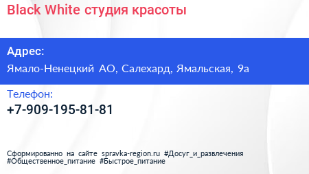 Black & White, студия красоты по адресу Ямало-Ненецкий АО, Салехард, Ямальская, 9а в дальнейшем Организация, размещена в следующих категориях: