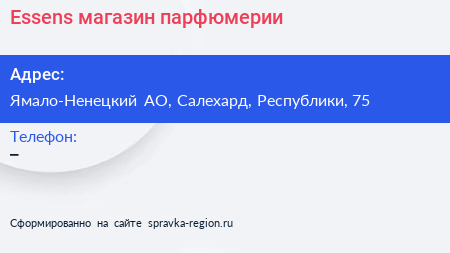 Essens, магазин парфюмерии по адресу Ямало-Ненецкий АО, Салехард, Республики, 75 в дальнейшем Организация, размещена в следующих категориях: