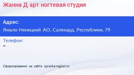 Жанна Д`арт, ногтевая студия по адресу Ямало-Ненецкий АО, Салехард, Республики, 79 в дальнейшем Организация, размещена в следующих категориях:
