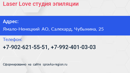 Laser Love, студия эпиляции по адресу Ямало-Ненецкий АО, Салехард, Чубынина, 25 в дальнейшем Организация, размещена в следующих категориях: