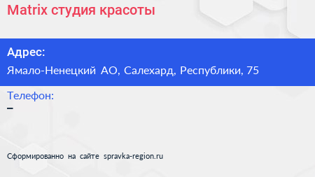Matrix, студия красоты по адресу Ямало-Ненецкий АО, Салехард, Республики, 75 в дальнейшем Организация, размещена в следующих категориях: