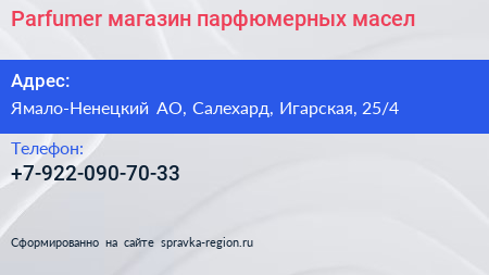 Parfumer, магазин парфюмерных масел по адресу Ямало-Ненецкий АО, Салехард, Игарская, 25/4 в дальнейшем Организация, размещена в следующих категориях: