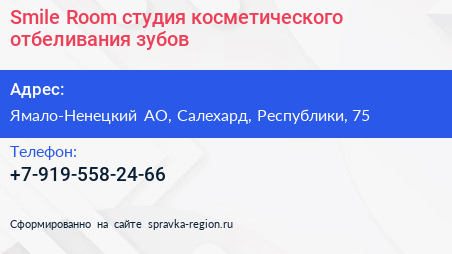 Smile Room, студия косметического отбеливания зубов по адресу Ямало-Ненецкий АО, Салехард, Республики, 75 в дальнейшем Организация, размещена в следующих категориях: