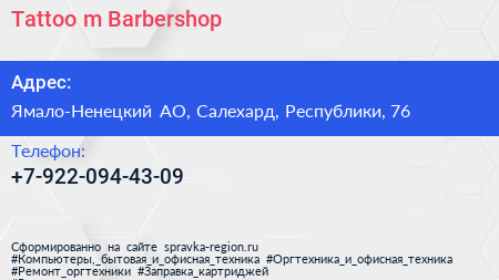 Tattoo.m.Barbershop по адресу Ямало-Ненецкий АО, Салехард, Республики, 76 в дальнейшем Организация, размещена в следующих категориях: