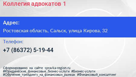 Коллегия адвокатов №1 по адресу Ростовская область, Сальск, улица Кирова, 32 в дальнейшем Организация, размещена в следующих категориях: