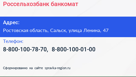 Россельхозбанк, банкомат по адресу Ростовская область, Сальск, улица Ленина, 47 в дальнейшем Организация, размещена в следующих категориях: