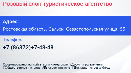 Розовый слон, туристическое агентство по адресу Ростовская область, Сальск, Севастопольская улица, 55 в дальнейшем Организация, размещена в следующих категориях: