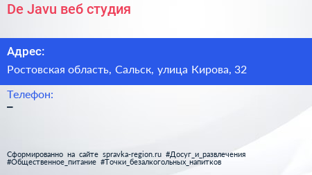 De Javu, веб-студия по адресу Ростовская область, Сальск, улица Кирова, 32 в дальнейшем Организация, размещена в следующих категориях: