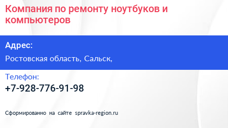 Компания по ремонту ноутбуков и компьютеров по адресу Ростовская область, Сальск, в дальнейшем Организация, размещена в следующих категориях: