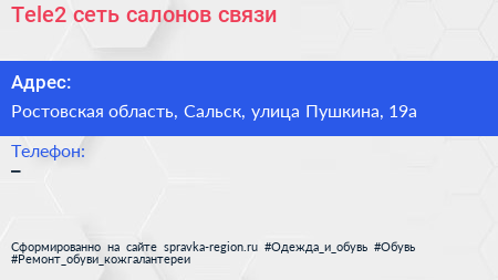 Tele2, сеть салонов связи по адресу Ростовская область, Сальск, улица Пушкина, 19а в дальнейшем Организация, размещена в следующих категориях: