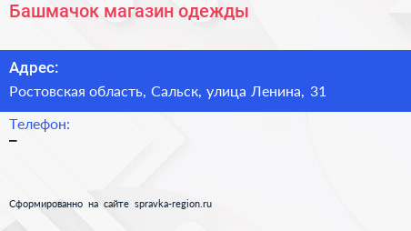 Башмачок, магазин одежды по адресу Ростовская область, Сальск, улица Ленина, 31 в дальнейшем Организация, размещена в следующих категориях: