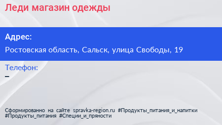 Леди, магазин одежды по адресу Ростовская область, Сальск, улица Свободы, 19 в дальнейшем Организация, размещена в следующих категориях: