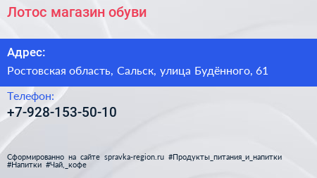 Лотос, магазин обуви по адресу Ростовская область, Сальск, улица Будённого, 61 в дальнейшем Организация, размещена в следующих категориях: