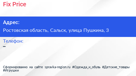 Fix Price по адресу Ростовская область, Сальск, улица Пушкина, 3 в дальнейшем Организация, размещена в следующих категориях: