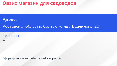 Оазис, магазин для садоводов по адресу Ростовская область, Сальск, улица Будённого, 20 в дальнейшем Организация, размещена в следующих категориях: