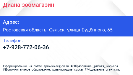 Диана, зоомагазин по адресу Ростовская область, Сальск, улица Будённого, 65 в дальнейшем Организация, размещена в следующих категориях: