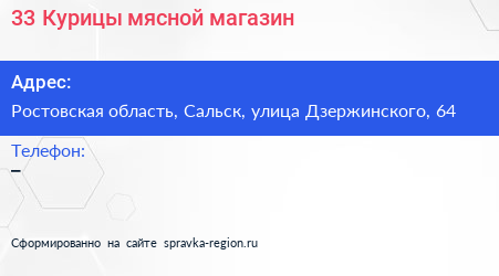 33 Курицы, мясной магазин по адресу Ростовская область, Сальск, улица Дзержинского, 64 в дальнейшем Организация, размещена в следующих категориях: