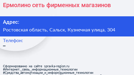 Ермолино, сеть фирменных магазинов по адресу Ростовская область, Сальск, Кузнечная улица, 304 в дальнейшем Организация, размещена в следующих категориях:
