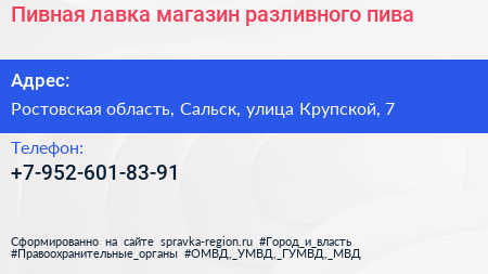 Пивная лавка, магазин разливного пива по адресу Ростовская область, Сальск, улица Крупской, 7 в дальнейшем Организация, размещена в следующих категориях: