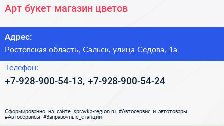 Арт букет, магазин цветов по адресу Ростовская область, Сальск, улица Седова, 1а в дальнейшем Организация, размещена в следующих категориях: