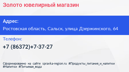 Золото, ювелирный магазин по адресу Ростовская область, Сальск, улица Дзержинского, 64 в дальнейшем Организация, размещена в следующих категориях: