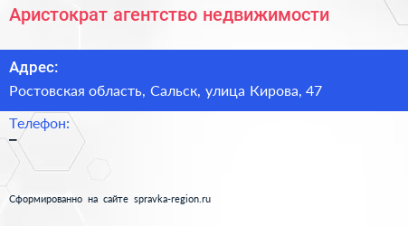 Аристократ, агентство недвижимости по адресу Ростовская область, Сальск, улица Кирова, 47 в дальнейшем Организация, размещена в следующих категориях: