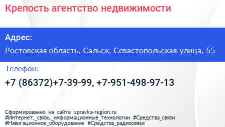Крепость, агентство недвижимости по адресу Ростовская область, Сальск, Севастопольская улица, 55 в дальнейшем Организация, размещена в следующих категориях: