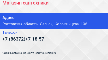 Магазин сантехники по адресу Ростовская область, Сальск, Коломийцева, 106 в дальнейшем Организация, размещена в следующих категориях: