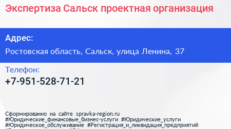 Экспертиза Сальск, проектная организация по адресу Ростовская область, Сальск, улица Ленина, 37 в дальнейшем Организация, размещена в следующих категориях: