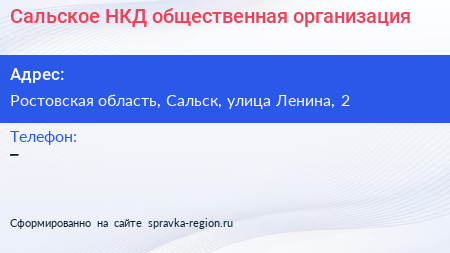 Сальское НКД, общественная организация по адресу Ростовская область, Сальск, улица Ленина, 2 в дальнейшем Организация, размещена в следующих категориях: