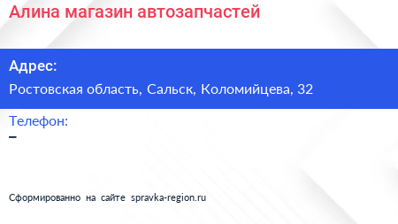 Алина, магазин автозапчастей по адресу Ростовская область, Сальск, Коломийцева, 32 в дальнейшем Организация, размещена в следующих категориях: