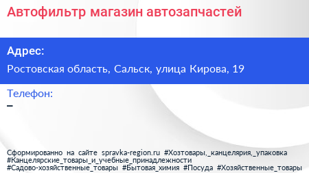 Автофильтр, магазин автозапчастей по адресу Ростовская область, Сальск, улица Кирова, 19 в дальнейшем Организация, размещена в следующих категориях: