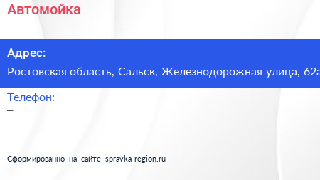 Автомойка по адресу Ростовская область, Сальск, Железнодорожная улица, 62а в дальнейшем Организация, размещена в следующих категориях: